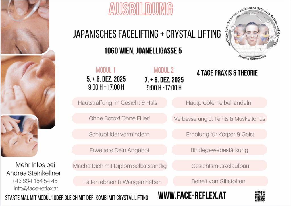 Träumst du von einer erfüllenden Tätigkeit im Beauty- und Wellnessbereich? 🌿💆♀️ Dann entdecke die Kunst des Japanischen Faceliftings und Crystal Liftings nach der Methode von Lone Sorensen!