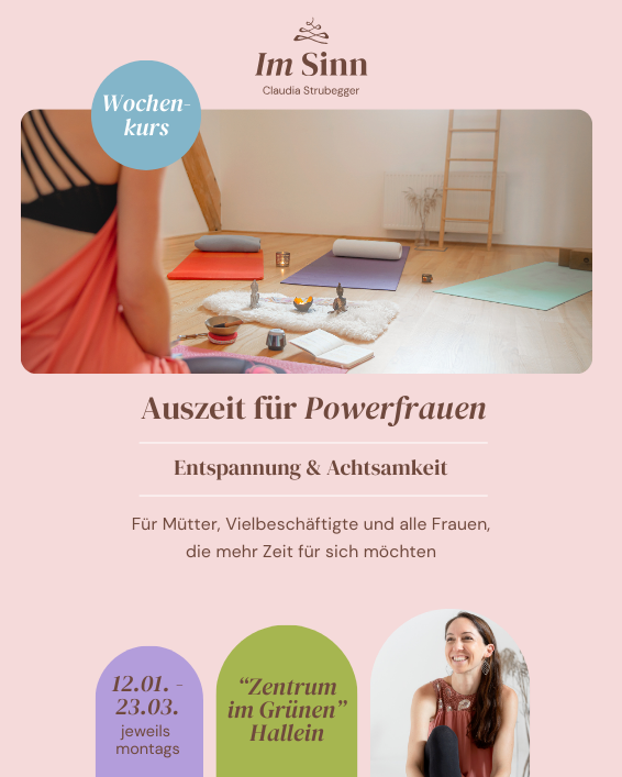 Dieser Kurs richtet sich an (mehrfach belastete) Mütter und Frauen, die im Alltag und in der Hektik der Zeit zu wenig Zeit für sich selbst finden. Keine Zeit zum Atmen, zum ICH-Sein, zum Denken oder Entspannen. Wir werden 1h lang unseren Fokus nur auf uns und unsere Entspannung, unser Wohlbefinden, unsere Ruhe und das Genießen legen. Es wird jeweils einen kurzen Input geben bzw. ein Thema der Woche. Das Ziel ist es, loszulassen und einfach im Hier und Jetzt sein zu dürfen. Wir werden kurze Übungen machen, es wird kleine Impulse von mir geben sowie Übungen auch für zuhause bei Interesse und Bedarf.