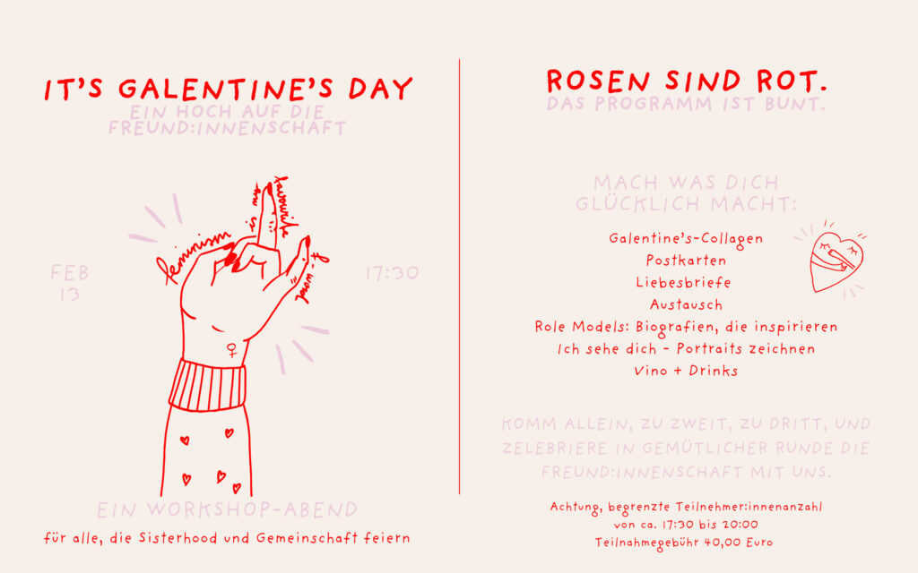 Am 13.2. schaffen wir im Lili im 18. Bezirk Platz für alle, die Sisterhood, Freund:innenschaft und Solidarität feiern. In gemütlicher Runde kannst du aus diesen Programmpunkten wählen: