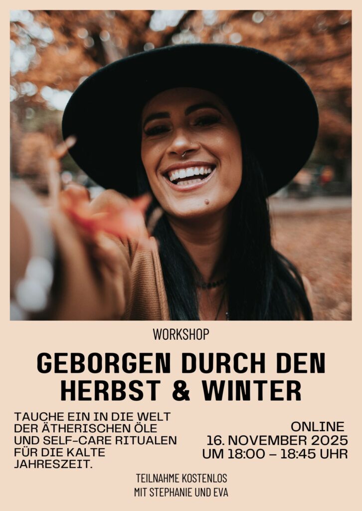 In diesem kostenlosen 40-minütigen Impuls-Workshop mit der Aromatherapeutin Stephanie (Instagram: tropfenweiseglück) und der ganzheitlichen Frauengesundheitsberaterin Eva (Instagram: viva.hormona) lernst du, wie du deine Seele mit einfachen, natürlichen Mitteln streichelst und dir selbst einen Ort der Geborgenheit schaffst.