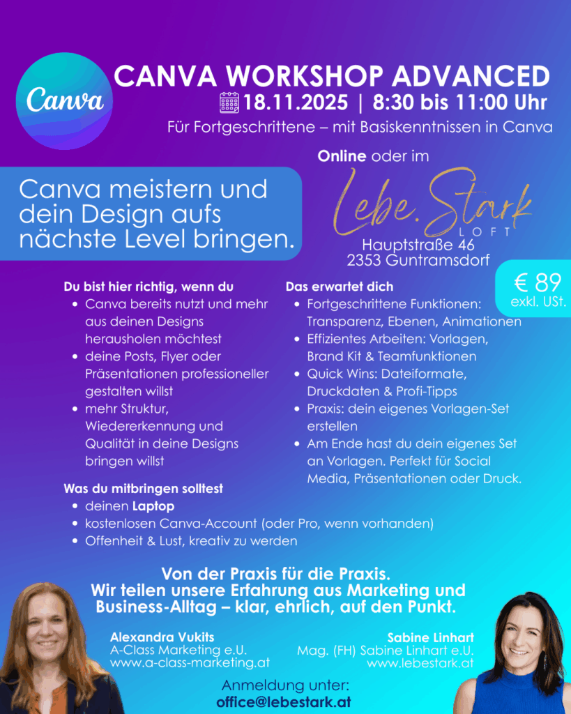 Für Fortgeschrittene, die bereits die Basisfunktionen von Canva kennen.