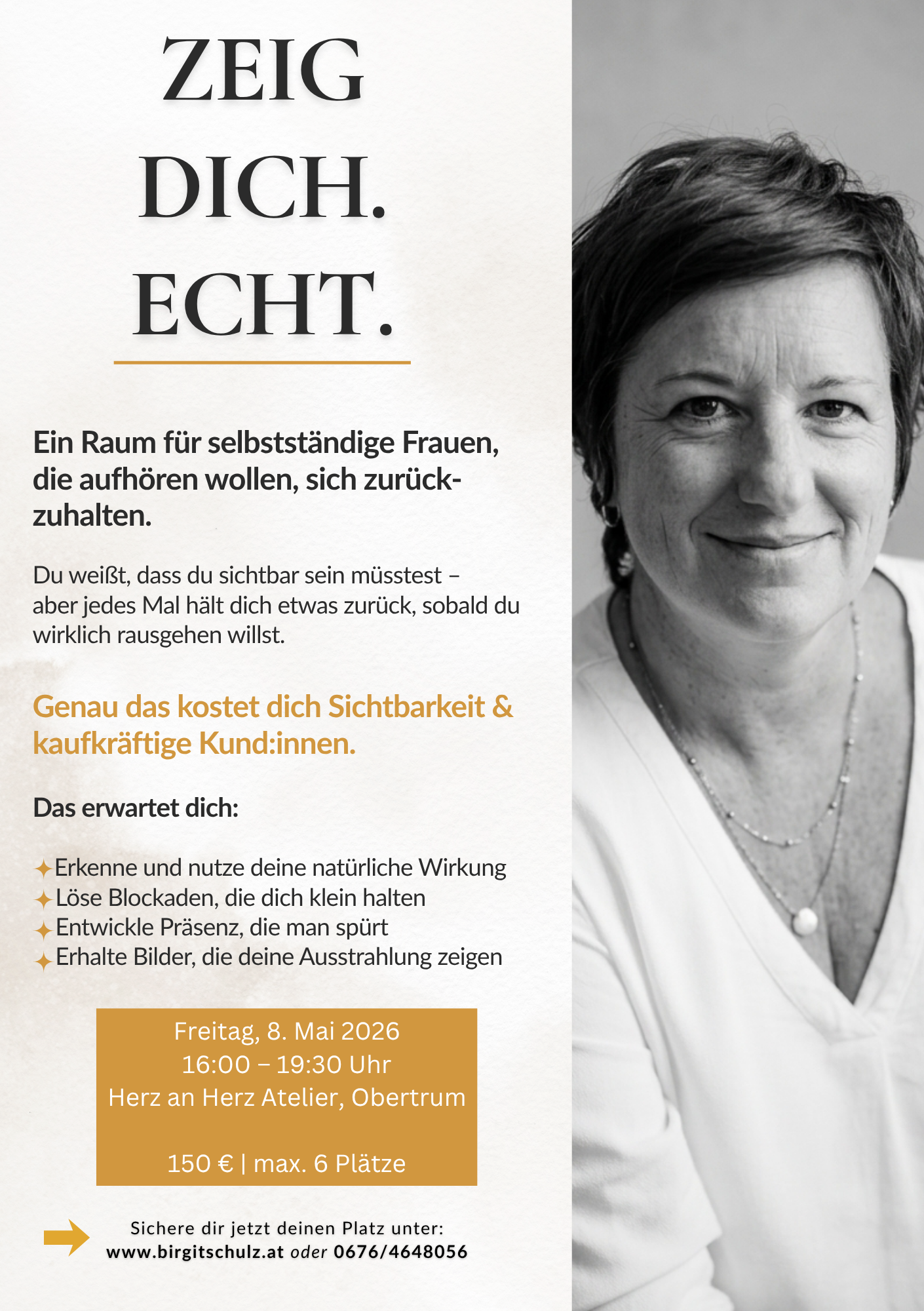 Ein transformierender Raum für selbstständige Frauen, die aufhören wollen, sich zurückzuhalten und lernen möchten, sich mit echter Präsenz, natürlicher Ausstrahlung und innerer Sicherheit sichtbar zu zeigen. Viele selbstständige Frauen wissen, dass mehr in ihnen steckt und trotzdem halten sie sich zurück, sobald es darum geht, sich wirklich zu zeigen. Sie zerdenken ihre Sichtbarkeit, verstecken sich […]