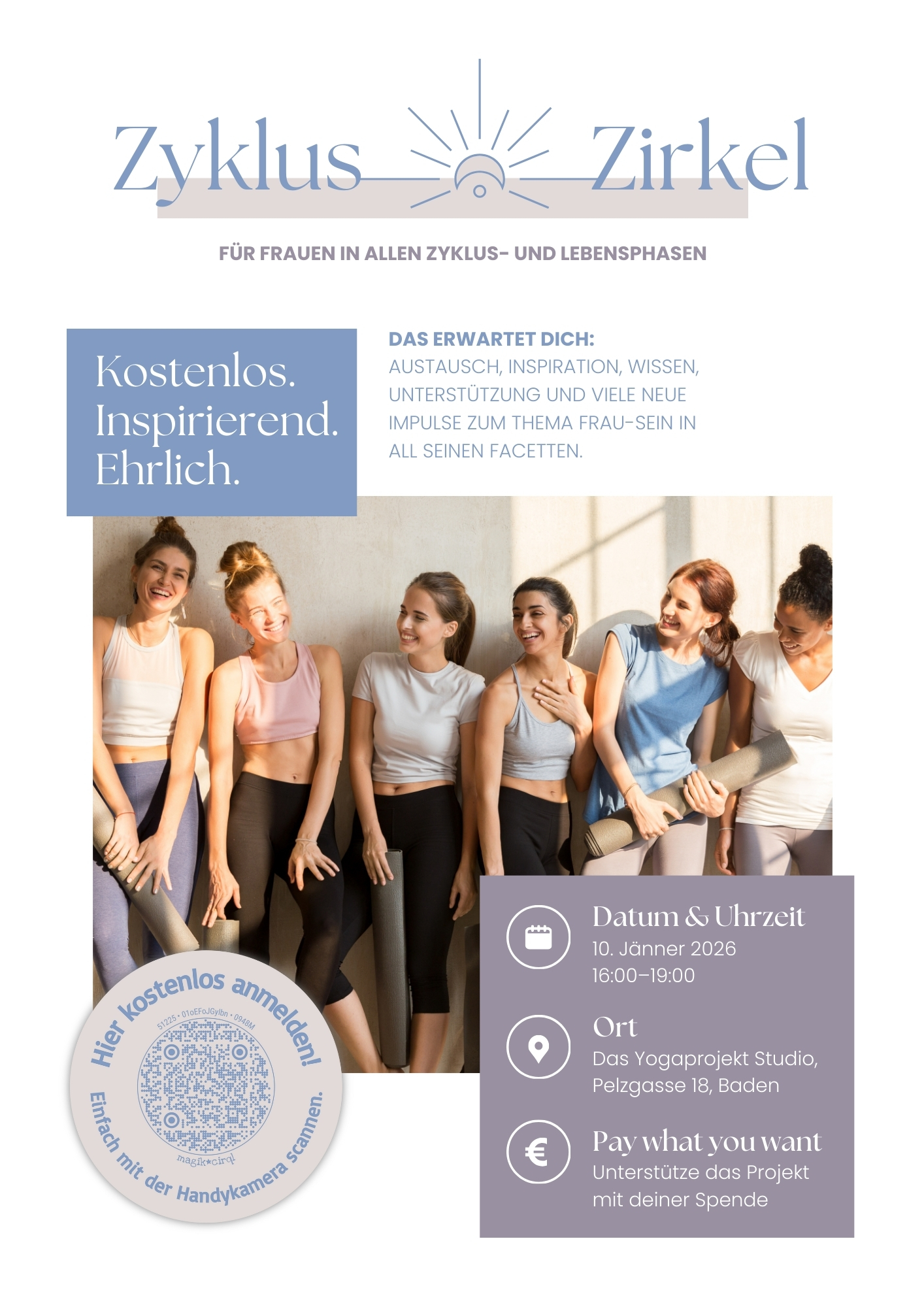 Der Zyklus Zirkel ist ein monatliches kostenloses Treffen (Spende nach Belieben zur Unterstützung des Projekt), in dem wir Frauen über alles sprechen können, was uns mit oder ohne Zyklus beschäftigt. Diesmal geht es um Sport und Bewegung im Einklang mit dem weiblichen Zyklus bzw. weiblichen Körper.