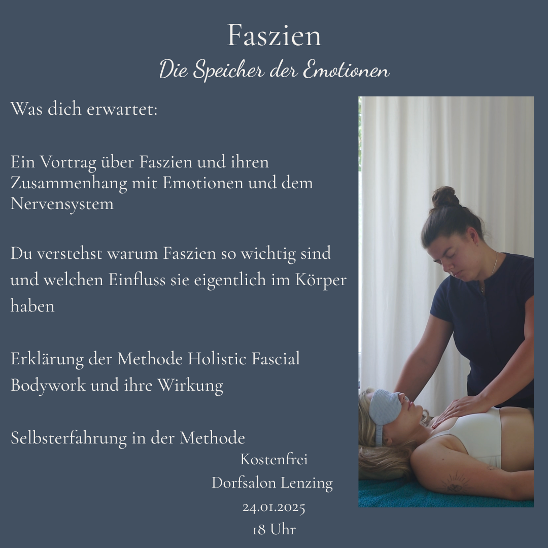 Ich freue mich sehr darauf, einen Vortrag über Faszien und somit auch über die Methode Holistic Fascial Bodywork zu halten. Erfahre, wie Faszien unseren ganzen Körper und unsere Gefühlswelt beeinflussen und wie unsere Vergangenheit unseren Körper formt. Anschließend gehen wir noch in die Selbsterfahrung. Das Event ist kostenfrei. Anmeldung an sophia.lachmund@gmx.at oder bei Instagram @sophia_lachmund