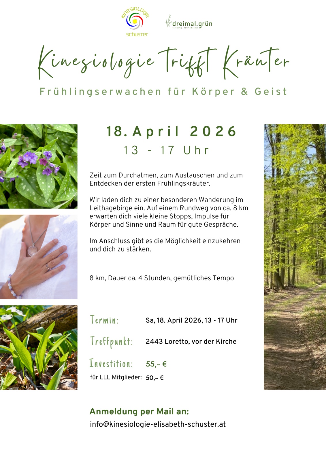 Zeit zum Durchatmen, zum Austauschen und zum Entdecken der ersten Frühlingskräuter. Wir laden dich zu einer besonderen Wanderung im Leithagebirge ein. 8km, ca. 4h, gemütliches Tempo Anmeldung: info@kinesiologie-elisabeth-schuster.at