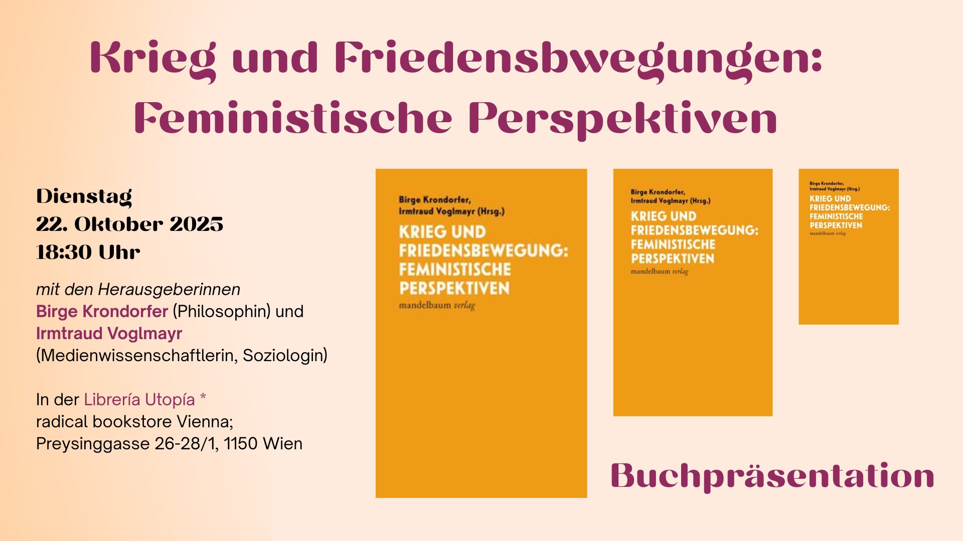 libreria utopia Preysinggasse 26-28/1, Wien, AustriaMandelbaum Verlag 2025 mit den Herausgeberinnen Birge Krondorfer (Philosophin), Irmtraud Voglmayr (Medienwissenschaftlerin, Soziologin) In diesem Buch setzten wir uns mit Krieg, Gewalt, Militarisierung, Geschlechterverhältnissen und Frauen-Friedensbewegungen aus einer interdisziplinären Perspektive auseinander. Der Band versammelt Texte zu historischen und aktuellen Frauen-Friedensbewegungen, zu gegenwärtigen Kriegsgeschehnissen und grundlegenden Fragen zu patriarchaler Gewalt. Nach den Darstellungen gibt es die […]