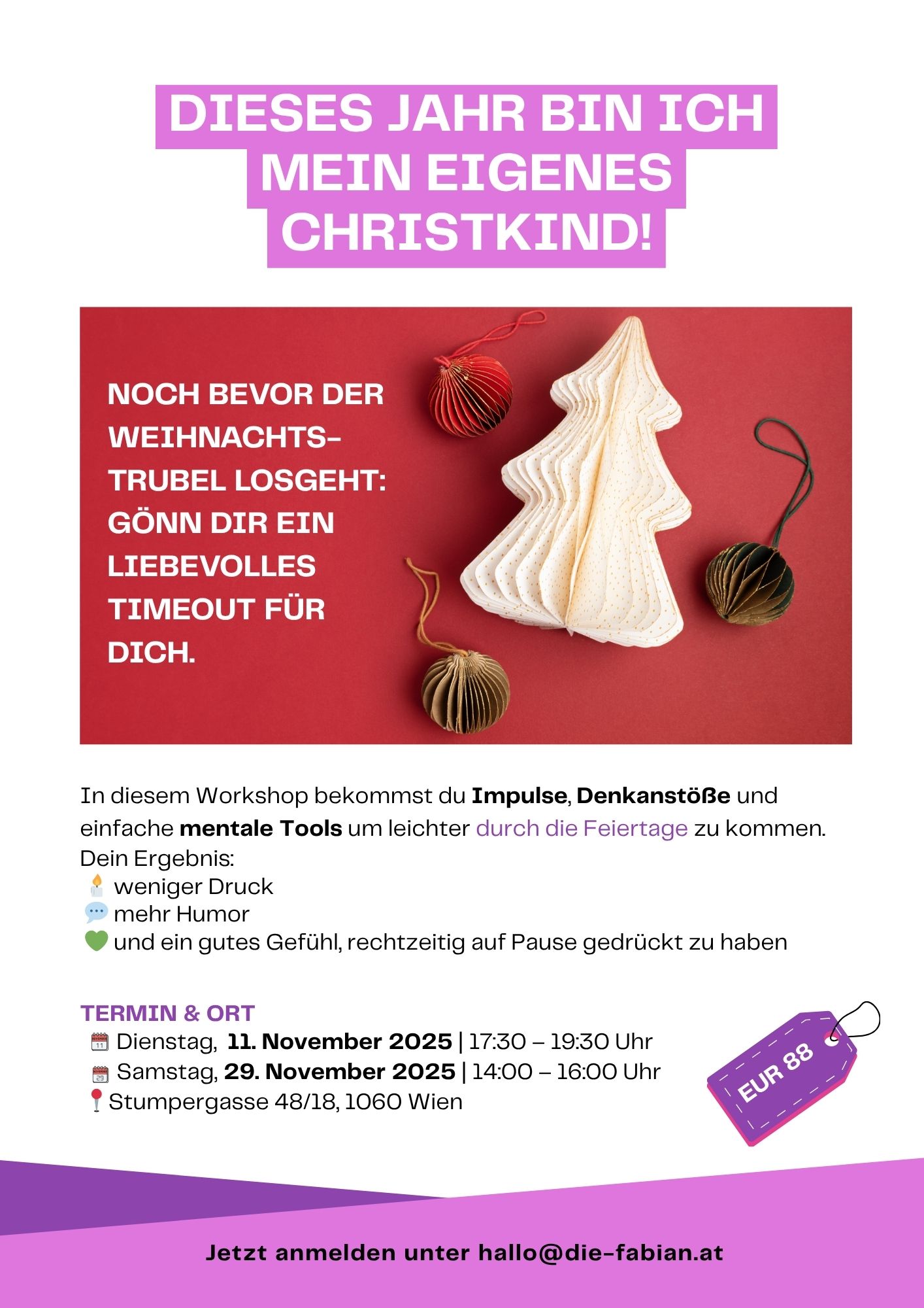 Praxiskreis Stumpergasse 48/18, Wien, Wien, AustriaDie Vorweihnachtszeit kann wunderschön sein und trotzdem viele Frauen an ihre Grenzen bringen. Zwischen Geschenke-Listen, Familien-Organisation und Arbeit bleibt oft keine Minute zum Durchatmen. Man funktioniert und merkt erst zu spät, dass die eigene Energie längst leer ist. Genau hier setzt dieser Workshop an.Du bekommst einfache mentale Tools und Denkanstöße, mit denen du rechtzeitig auf […]